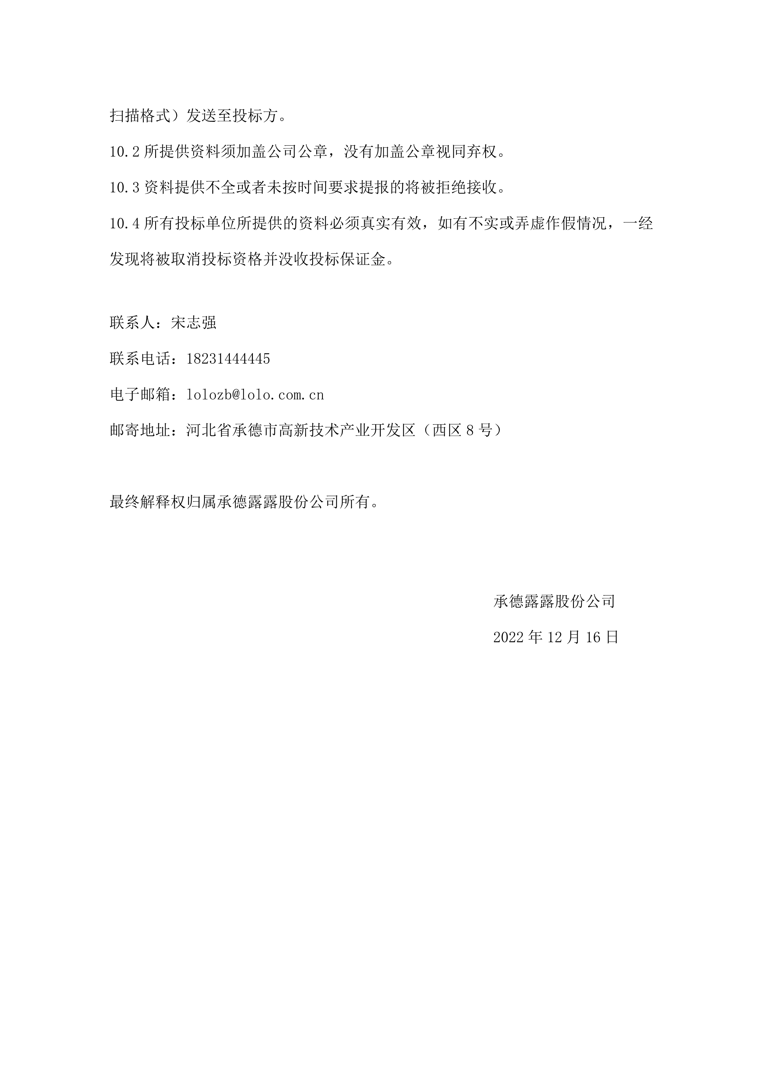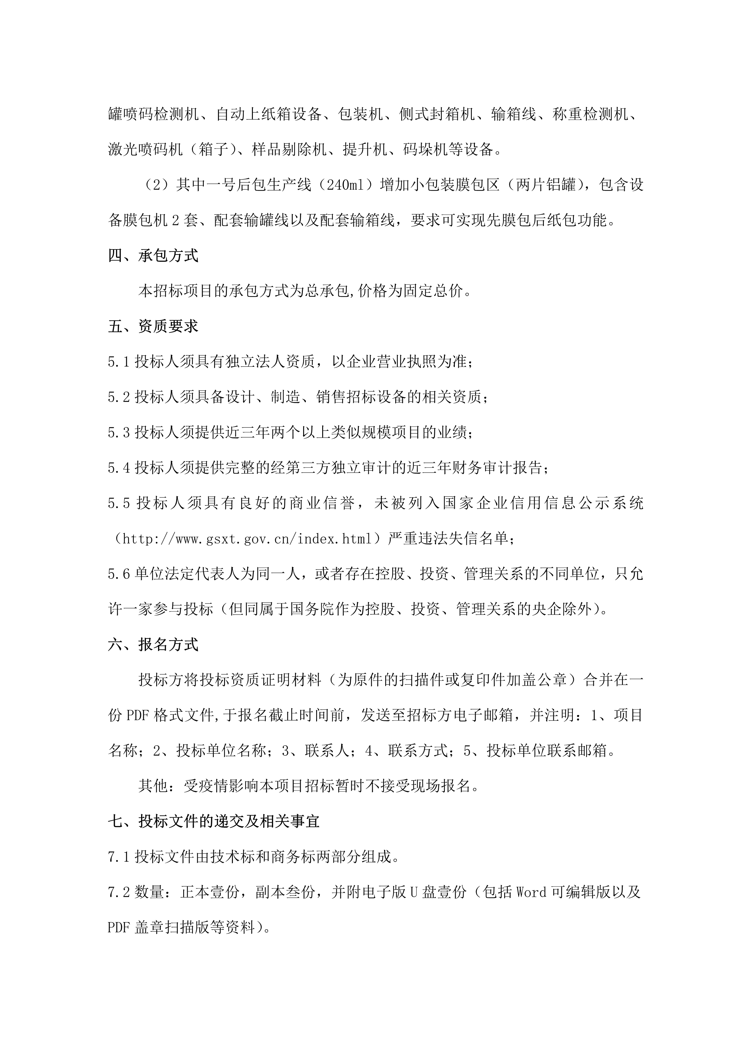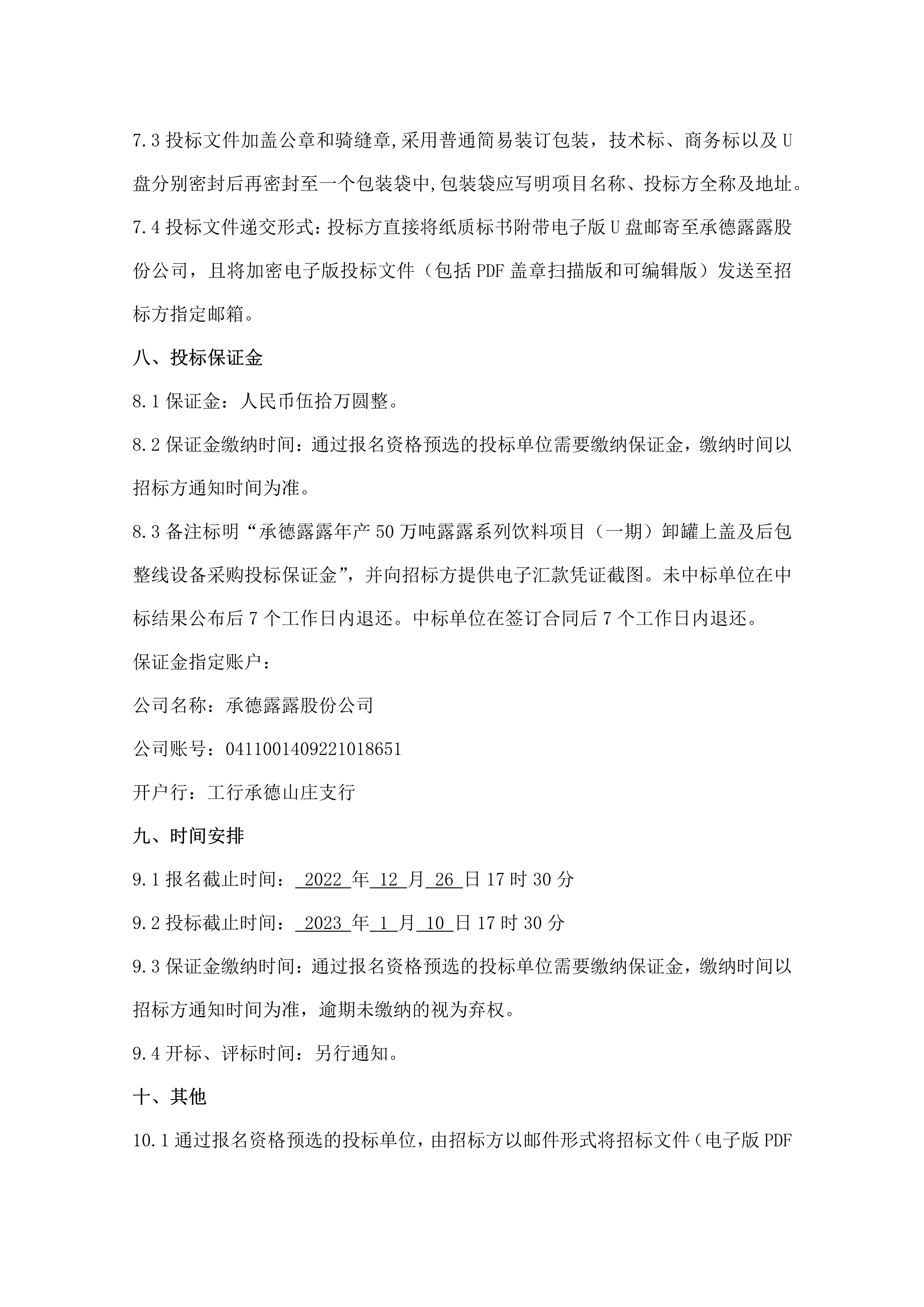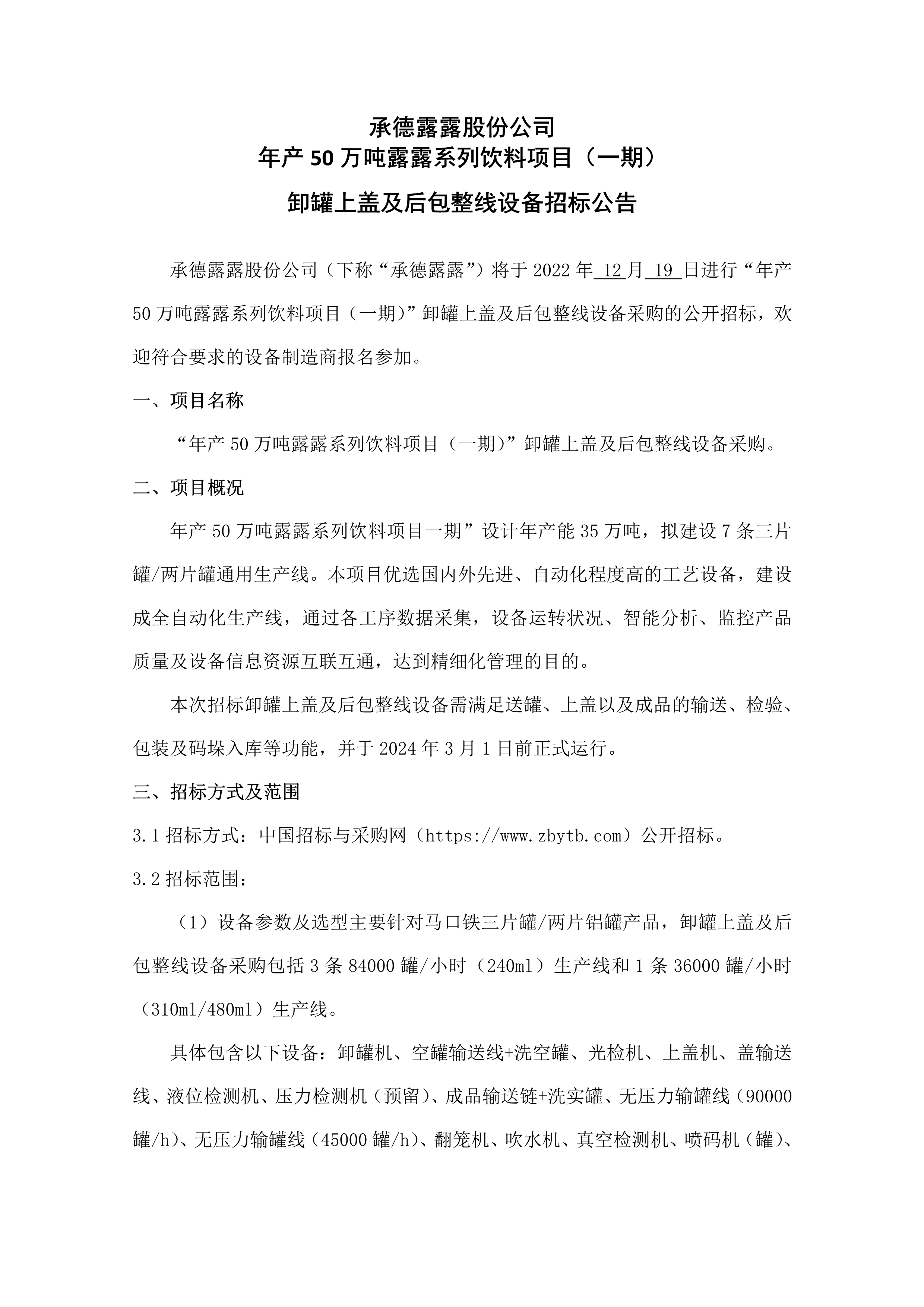 承德露露股份公司 年產 50 萬噸露露系列飲料項目(一期) 卸罐上蓋及后包整線設備招標公告